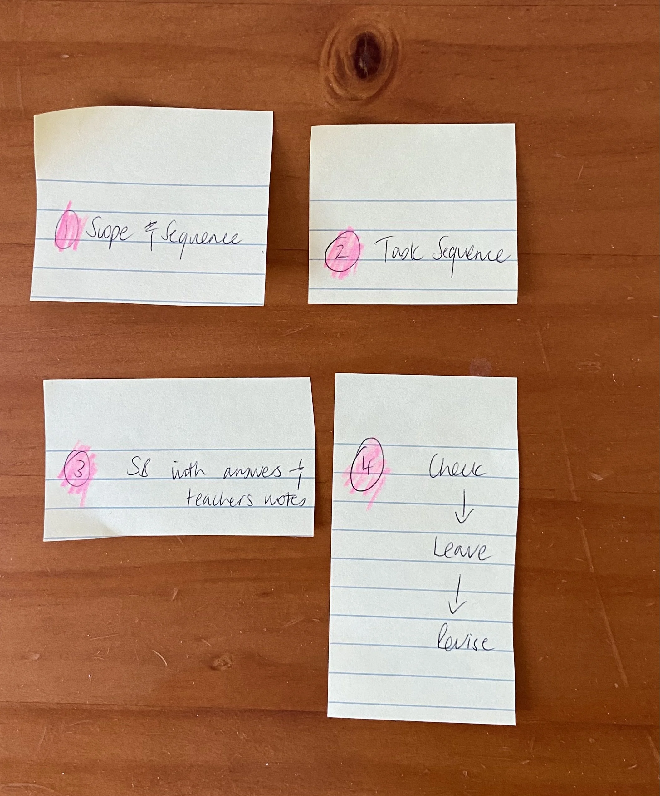 1 I look at the scope and sequence. This document is usually an enormous excel sheet with multiple tabs, colours and columns! But it details everything to be included in the book/unit/page. Basically, it’s the ingredients – and you can’t miss any out! In other words, by looking at this, I can see what the learning objectives are – so what the learners should know by the end. I’m a big believer in looking at the destination before the route!